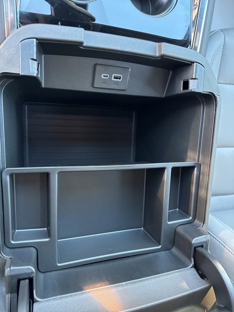 Storage area, cup holders and auxiliary power outlet, located in the rear of the center console